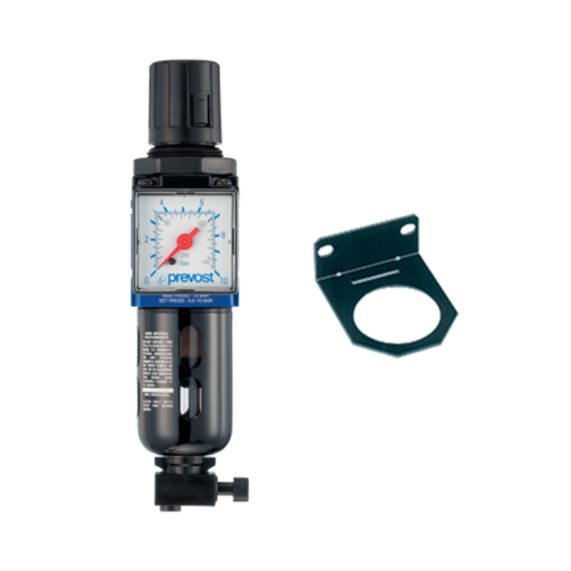 Filtro regulador de aire con rosca G 1/4″ BSPP, con manómetro y fijación. Presión máx. 12 bar. Cuerpo de aluminio. Uso profesional. Prevost.